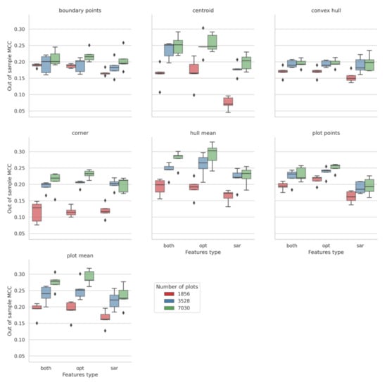Sixth, we demonstrate that no plot observations should be excluded from model training based on a minimum plot area threshold—another important note for future surveys. Finally, the experiments to quantify the effect of satellite data sources on crop type classification performance suggest that optical features alone can provide sufficient signals to maximize prediction quality. We observed only small differences between models built only with optical features and those using optical and SAR features. In the case of maize area mapping in Malawi, the potential benefits offered by SAR—providing signals unaffected by cloud cover—were offset by additional noise introduced with SAR imagery.