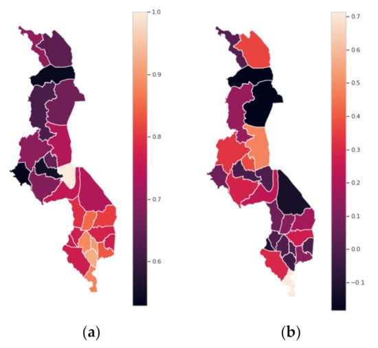 We used S2 Level-1C imagery hosted in Google Earth Engine in our analysis [23]. This imagery consists of top-of-atmosphere reflectance observations. The European Space Agency (ESA) also distributes S2 Level-2A imagery, which consists of surface reflectance values. However, this higher-level product does not provide complete coverage in the geographies of our interest, in the years prior to 2019. A second alternative is to generate Level-2A imagery from Level-1C imagery using the ESA’s Sen2Cor toolbox [25]. However, this approach would have been challenging in terms of computation and storage requirements. Hence, we used a simple linear regression model to convert top-of-atmosphere reflectance values for each band to surface reflectance values, as given in Equation (1). We calculated and separately for Malawi and Ethiopia, using about 1000 pairs of pixels sampled randomly from the Level-1C and Level-2A products for the respective country from 1 January 2019 to 31 December 2019. We justify our use of a simple linear relationship across the entire time period as follows: (1) previous studies have found that using top-of-atmosphere reflectance is comparable to using surface reflectance for land cover classification, as the classification model is driven by relative spectral differences [26,27]; and (2) the linear relationship obtained between the GCVI obtained from top-of-atmosphere imagery and that obtained from surface reflectance values was found to be fairly consistent throughout the growing season [4]. We used a simple linear relationship. Furthermore, we masked out pixels containing clouds, shadows, haze or snow from the S2 imagery using a decision-tree classifier [4] (see Appendix A Table A1 for summary statistics on imagery counts).