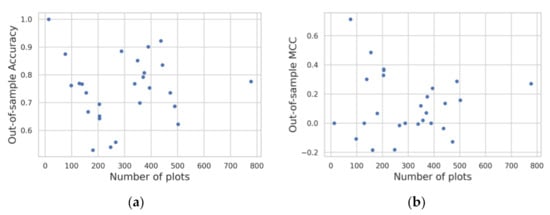 Each model was evaluated on its ability to correctly distinguish between maize and non-maize pixels in the testing segment of the dataset (out-of-sample). We calculated two performance metrics: accuracy (Equation (5)) and the Matthews’ Correlation Coefficient (MCC, Equation (6)). Accuracy measures the fraction of correct predictions to total predictions. An accuracy score of 1 represents perfect prediction, and 0 indicates completely wrong prediction. MCC improves on the standard accuracy score in cases where the observed prevalence of one prediction class (e.g., not maize) is much larger than other classes. An MCC score of +1 represents a perfect prediction, 0 represents random prediction, and −1 an inverse prediction.