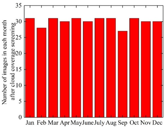 On 7 May 2013, the ESA PROBA-V microsatellite, where V stands for vegetation, was successfully launched. The satellite has a size of 76 mm × 73 mm × 84 mm, a mass of 160 kg, and an inclination angle of 98.1° to its orbit. This satellite is the fourth in the PROBA series and is primarily used for global vegetation observation [25]. PROBA-V supports a number of applications, such as land cover, crop monitoring for global vegetation classification, forecasting, famine, food security, disaster management, and biosphere research [26]. Its spectral range is roughly the same as that of the SPOT series of vegetation sensors, but it has a higher spatial resolution. PROBA-V data are available in five bands: BLUE, RED, NIR, SWIR, and NDVI. The satellite provides daily images at 100 m and 333 m. A small amount of data and a larger number of available images are used in this paper. The data are based on the GEE platform for the relevant calculations. As the study area is located in the equatorial region, it receives more solar radiation and water vapor than other regions, and the vertical air currents develop more vigorously and has more cloud cover than other places. Therefore, the data are preprocessed, including converting the DN value of each band into reflectivity, cloud screening, etc. The cloud removal function is constructed according to the SM band in the data, and the data are processed. Because the study area distinguishes between rainy season and dry season, the images of rainy season and dry season are extracted respectively. The time span is 1 year, and the cloud amount is set to less than 20%. The figure below shows the number of images in each month after preprocessing (Figure 2).