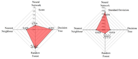 Commonly used classification algorithms include random forest algorithm, decision tree algorithms, neural network algorithms, and nearest neighbor algorithms [42]. The selection of different algorithms as iterative models affects the feature optimization in the later stage. Therefore, this paper first compares the scores and standard deviations of several different machine learning algorithms after RFE packing, and the results are shown in Figure 6. From the figure, it can be seen that the scores and standard deviations of different algorithms are different when they are wrapped by RFE. The recursive feature elimination-random forest algorithm (RFE-RF) and the recursive feature elimination decision tree algorithm have higher scores and smaller standard deviations. However, the former scored the highest in comparison. The score and standard deviation were 0.903 and 0.012, respectively. The standard deviation of the neural network-recursive feature elimination algorithm was the highest at 0.059. It is further illustrated that, compared with other algorithms combined with RFE, the stability of searching for the optimal feature combination is higher.