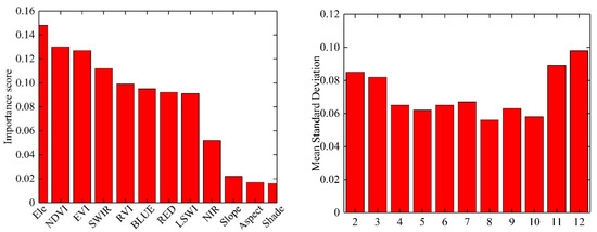 The process of using the RFE-RF algorithm for feature selection is as follows. The first is the process of random forest. The bootstrap sampling method is used to extract multiple samples from the original samples, and a decision tree is constructed for each bootstrap sample. All decision trees form a RF, and calculate feature importance in the model. Subsequently, the feature evaluation of forward iteration is introduced, corresponding features are added in sequence according to the feature importance score until all features are added to the model to participate in modeling, and finally the optimal feature combination participating in classification is determined. In the process of feature selection with the recursive feature elimination random forest algorithm (RFE-RF), the average standard deviation is used to evaluate the quality of the feature optimization results. In the process of feature selection by RFE-RF, the average standard deviation is used to evaluate the result of feature optimization. In the feature selection process, the first features selected were those with the top two feature importance scores, i.e., elevation and normalized difference vegetation index (NDVI), and the RFE-RF algorithm is used to calculate the mean standard deviation of feature optimization selection using these two features. Then, one feature was added in order of importance according to the remaining features, and the mean variance value of the added feature was calculated using RFE-RF algorithm until all 12 features participated in the modelling. After iteration, the optimal feature combination was selected according to the average standard deviation value. In Figure 7, it can be seen that, as the number of features continues to increase, the average standard deviation value shows the general trend of first decreasing and then increasing until the average standard deviation value reaches the maximum when all of the features are added. The larger the average standard deviation value, the less effective the RFE-RF is in optimizing the features. The optimal number of features after RFE-RF feature selection is eight, and the optimal feature combinations are elevation, NDVI, EVI, SWIR, RVI BLUE, RED, and LSWI. Table 3 shows the comparison of feature numbers before and after optimization by the RFE-RF algorithm.