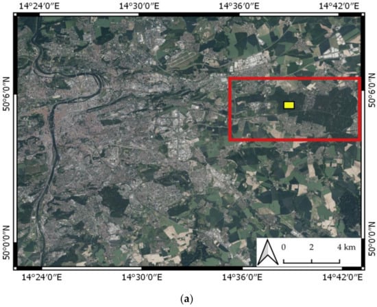 RGB imagery of the study site: (a) Klánovice forest (red rectangle) and study site (yellow rectangle) located near Prague; (b) RGB orthomosaic of the study site.