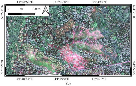 Photogrammetric processing was performed in Agisoft Metashape Professional 1.6.2. using the standard procedure for multispectral images, including reflectance calibration [49]. Onboard real-time kinematics (RTK) global navigation satellite system (GNSS) data were used for image alignment using high accuracy settings. After the alignment, the dense cloud was generated using high-quality and aggressive depth filtering. Based on dense clouds, the digital surface model (DSM) was computed and projected into WGS84/UTM zone 33N. A multispectral mosaic was orthorectified based on images and DSM with a spatial resolution of 6 cm/pixel. The dense cloud was decimated to preserve only the highest point in each cell (0.2 m) of the grid that was virtually placed over the dense cloud. For a detailed description of the Klánovice forest, camera parameters and photogrammetric processing, we refer to Minařík et al. [50].