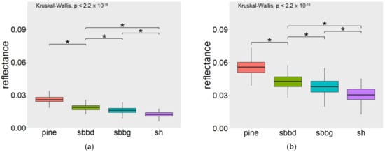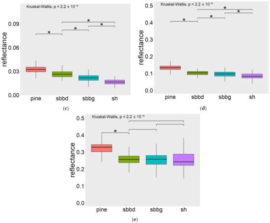Spectral separability of disturbance classes: (a) Band 1—Blue, 475 nm; (b) Band 2—Green 560 nm; (c) Band 3—Red, 668 nm; (d) Band 4—Red-edge, 717 nm; (e) Band 5—NIR, 840nm. * Marks the significant spectral differences (the significance level α = 0.05) among disturbance classes. The results of multiple comparisons are presented only for the most important disturbance classes reflecting the bark beetle infestation.