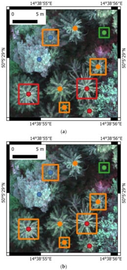 Around each identified treetop, a square bounding box (buffer) was automatically constructed. The size of the buffer was set according to the height distribution of identified treetops. The trees under the median height received bounding boxes (BBs) of 2 m size, those lower than quantile 0.75 received 3.2 m BB, and those higher than quantile 0.75 received 4 m BB centered on the treetops. The bounding box sizes were selected to cover at least the upper 50% of the crown where bark beetle infestation was the most significant [28].