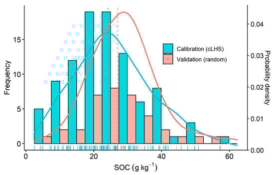 Soil organic carbon (SOC) content distribution in the calibration and validation datasets as represented by the histogram, density plot, and rug plot. Vertical dashed lines represent the mean values.