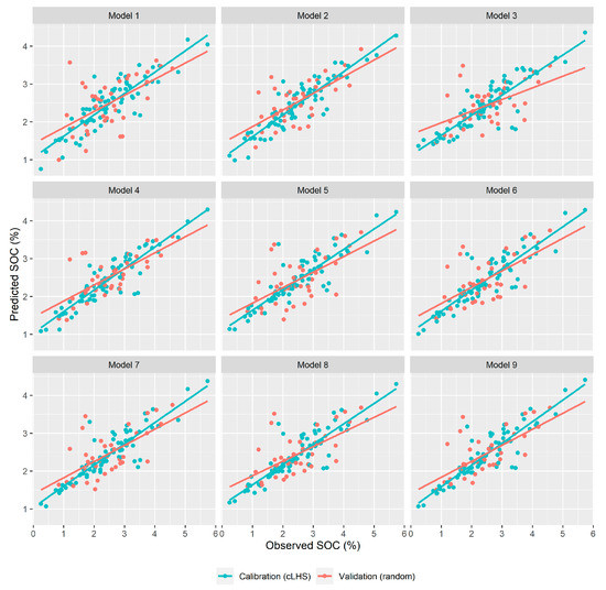 Observed and predicted SOC contents for the 9 models.