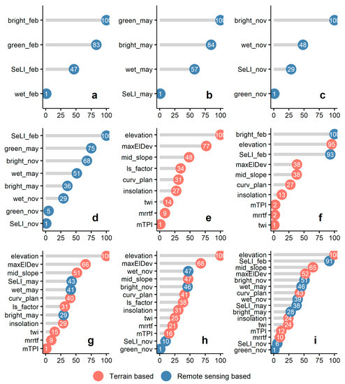 Variable importance for different prediction models. (a) Sentinel-2 (February), (b) Sentinel-2 (May), (c) Sentinel-2 (November), (d) Sentinel-2 (February, May, November), (e) Terrain only, (f) Terrain + Sentinel-2 (February), (g) Terrain + Sentinel-2 (May), (h) Terrain + Sentinel-2 (November), (i) All (Terrain + Sentinel-2 (February, May, November)).