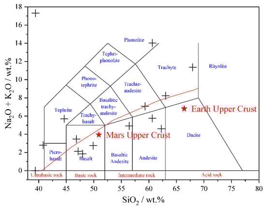 - McSween, H.Y.; Taylor, G.J.; Wyatt, M.B. Elemental composition of the Martian crust. Science 2009, 324, 736–739. [Google Scholar] [CrossRef]