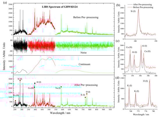 (a) LIBS spectra of GBW03124 before and after the noise and continuum are removed. (b–d) Comparison of plasma emission lines before and after pre-processing in UV, VIS, and VNIR ranges.