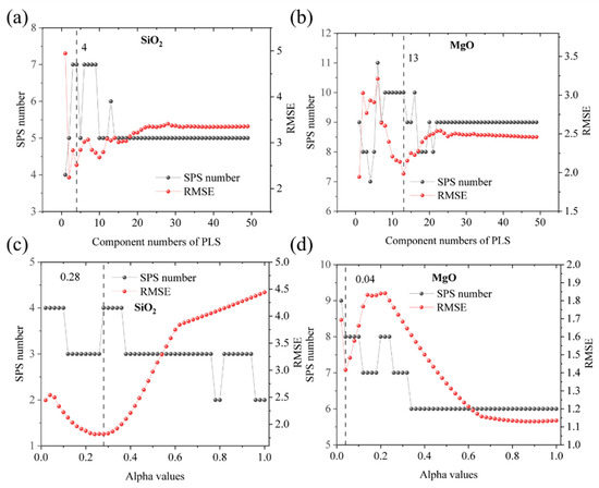 Selection of the number of factors in PLS models (a,b) and determined alpha values in LASSO models (c,d) for SiO2 and MgO. The optimized number of factors is simultaneously determined by a high SPS number (black points) and a low RMSE value (red points).