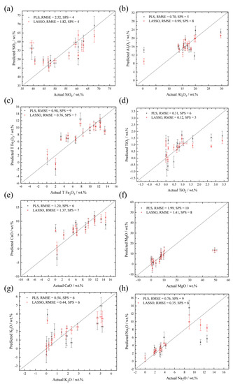 The hyperparameter in the PLS (component numbers) and LASSO (alpha value) algorithms are key parameters. In PLS regression, the use of too many factors can lead to overfitting, but models with a low number of factors exhibit poor performance [35,37]. The optimized number of factors in PLS and alpha values in LASSO are simultaneously determined by a high SPS number (black points in Figure 4) and a low RMSE value (red points in Figure 4) of 8 element compositions. For instance, the maximum SPS number of MgO (Figure 4b) appears when 6 factors are selected, but with a high RMSE of 3.21, indicating this point is not optimized for PLS regression. Likewise, the minimum RMSE of SiO2 and low SPS number are obtained when 2 factors are selected (Figure 4a), which are not optimized. Finally, 4, 11, 5, 13, 14, 6, 6, 11 factors are selected to build PLS models, and alpha values in LASSO models are determined as 0.28, 0.08, 0.04, 0.04, 0.08, 0.02, 0.02 and 0.04 to yield the abundance of SiO2, Al2O3, T Fe2O3, MgO, CaO, K2O, Na2O, and TiO2, respectively.