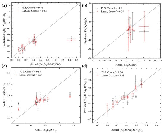 The predicted and actual (a) (Fe2O3 + MgO)/SiO2, (b) Fe2O3/MgO, (c) Al2O3/SiO2, and (d) (Na2O + K2O)/Al2O3. Predicted elemental ratios are based on the predicted oxides of major elements (wt.%) using the PLS and LASSO models mentioned above. The error bar on x-axis represents the standard deviation value of the results of 20 LIBS spectra collected from each sample.