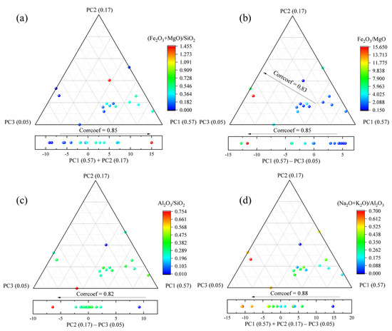 The ternary plots of relative chemical compositions (a–d: (Fe2O3 + MgO)/SiO2, Fe2O3/MgO, Al2O3/SiO2, and (Na2O + K2O)/Al2O3) with averaged PCA scores of each sample.