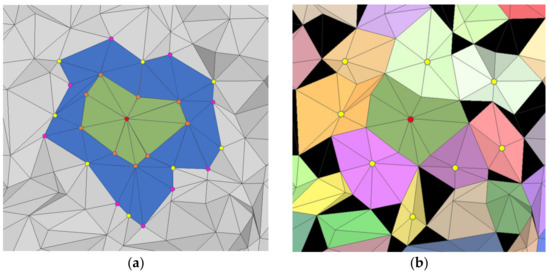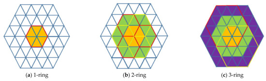 In step 1, we adopt SABMP’s conclusion that ring neighborhoods of order 3 outperform other orders. To speed up the calculation of 3-ring planarity, we propose a strategy based on a hierarchical index. Different from SABMP and other traditional methods traversing the k-ring neighborhood of each vertex directly, our method constructs the index relationship of ring neighborhoods between high order and low order and avoids the repeated search of neighborhood points. As shown in Figure 3, the k-ring neighborhood of a vertex can be represented by a set of the k-1 ring neighborhood, whose center point is the 1-ring neighborhood point of that vertex, and we can use the established hierarchical index to obtain all the k-ring neighborhood points.