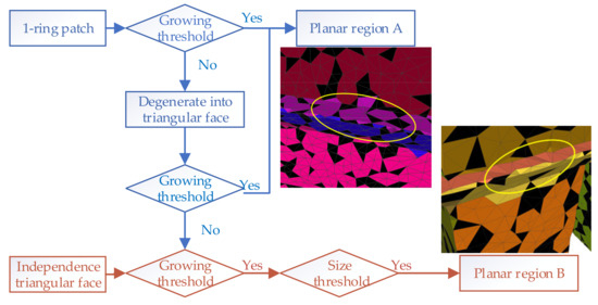 The first step of region growth of patches is selecting the patch with the greatest planarity as the seed point. The growth plane is then initialized by principal component analysis on the vertices contained in the patch. For the growth judgment of its neighborhood patch, both distance and normal direction threshold are used to improve the segmentation accuracy. If the growth of the neighborhood of the seed point fails, our method degenerates the patch into several triangular facets and recalculates the distance between the vertices of the triangular facet and the growth plane and the angle between the normal of the plane and the normal of the triangular facet. It should be noted that, due to the different growth spans of patches and triangular facets, different normal direction thresholds (anglepatch and angletri) are adopted, and the triangular facet cannot be used as the seed point of patch region growth. The distance threshold is a statistic that needs to be adjusted sometimes.