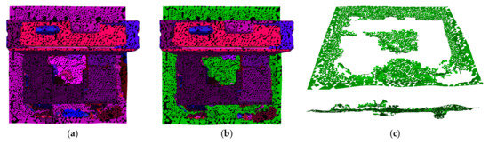 After the traversal of all the patches, many patches, without joining to any plane region, degenerate into triangles. These facets generally present as some slender strips or debris, which cannot be ignored for their importance of structure expression, so it is necessary to carry out the secondary growth of triangular facets. A seed facet was randomly selected from these facets, and the growth was carried out according to a certain distance and normal direction threshold until all the degradation facets are added to some plane regions that must have enough faces (size threshold = 10).