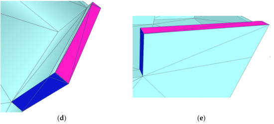 Using the projection of the building scaffold into the planar regions, we could obtain the candidate faces for the simplified mesh, as shown in Figure 8e. Considering the influence of false segmentation and the requirement of water tightness, a further step to determine whether a candidate face should be preserved was adopted using the method in SABMP.