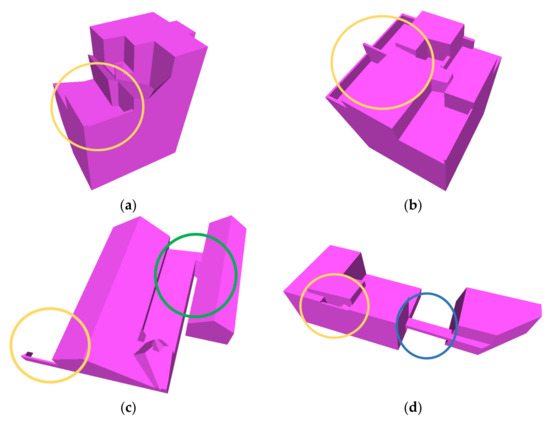 Example of structure-preserving capabilities. (a) Several parapets (gold circle) are successfully restored; (b) as a result of the restoration of the parapet, the adjacent structure is correctly reconstructed; (c) as a result of the topological modification of the slit region (green circle), the building structure on the left is also correctly restored; (d) connecting corridor (blue circle) is properly rebuilt.