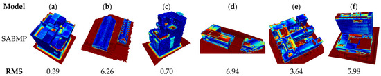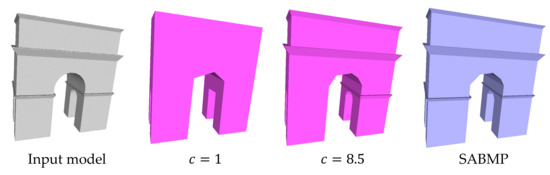 One problem of polygonization methods is that mesh simplification depends on a reasonable set of parameters. The VSA method needs to adjust the number of agent planes to obtain a better result and interactively fine-tune the agent planes if necessary. SABMP has two parameters that need to be adjusted. To obtain the optimal polygonal model, the performance of different parameter combinations must be tested. This is a very time-consuming process, but we still conducted a lot of tests and found the best parameter combination of model (a)–(g), as shown in Table 3. In contrast, the method we proposed did not need to adjust any parameters to obtain a building surface model with better quality.