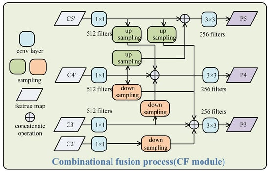 Here, we suggested a new feature fusion process called CF, as shown in Figure 3. It is unlike existing feature fusion methods, such as FPN, which walks a top-down fusion path from the deep layer to the shallow layer, or BiFPN [41], which contains two fusion steps with a top-down path and a bottom-up path, separately. The CF module also focuses on bi-directional fusion of feature maps from different layers, but it performs them at the same time. The features {C2′, C3′, C4′, C5′} from the GAM are taken as inputs of the CF module. They are first transformed into the same dimensions of 512 by 1 × 1 convolutional operations. Then, new features {P2, P3, P4, P5} are obtained through a series of sampling and combinational fusion processes, as in Equations (8)–(10). Here, the up-sampling and down-sampling processes adopt an interpolate operator with a ‘bilinear’ and 3 × 3 convolution operator with stride = 2, respectively. Finally, conv3 × 3 operations are performed for smoothing the fusion results.