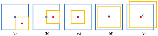 Lloc_c uses L2 loss to describe the error between the center coordinates of the real anchor and the predicted anchor, as in Equation (17). Lloc_c and Lloc together constitute the loss of the position and complement each other. As in Figure 5, the Lloc values of (a), (b), and (c) are probably the same; hence, the model cannot distinguish between them only by Lloc loss. However, their Lloc_c values are different, and the predicted anchor of (c) has the smallest loss by comparison, which is in line with our expectations. The Lloc definition of the original SSD includes the center coordinates and the width and height of the anchor. In Figure 5d,e, there are some deviations in the width and height in (d) and some deviations of the center coordinates in (e) between the real anchor and the predicted anchor. From the Lloc loss of the original SSD, they are probably the same, but (d) is always considered better in most cases. When using the proposed Lloc_c and Lloc definitions, (d) obtains a smaller loss value than that of (e), which is what we expect.