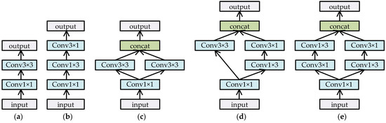 Different structures for reducing convolution computation. (a) Transformation by 1 × 1 and 3 × 3 convolution. (b) Transformation by 1 × 1, 1 × 3, and 3 × 1 convolutions. (c) Transformation by parallel two-way convolutions for (a). (d) Transformation by parallel two-way convolutions, one way for (a) and the other for (b). (e) Transformation by parallel two-way convolutions for (b).