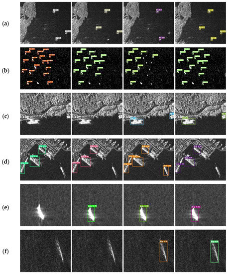 Comparison of the different detectors: from left to right are SSD, SSD+FPN, RetinaNet480, and CF-SSD. (a) inshore ship, (b) small offshore ship, (c) docked ship, (d) inshore and docked ship, (e) blurred offshore ship, (f) blurred offshore ship.