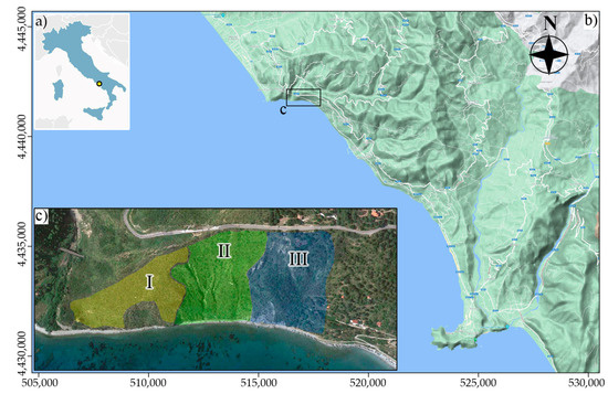 The study area is located along the Cilento coast in the Campania Region (southern Italy) (Figure 1). It covers a coastal area, which is affected by landslide phenomena [5]. The coastal area has been described as a “slope-over-wall” model, composed of a convex, colluvial, debris upper slope laying on remnants of a buried, uplifted marine platform covered by rounded, gravelly marine deposits hanging on the cliffed bedrock toe slope.