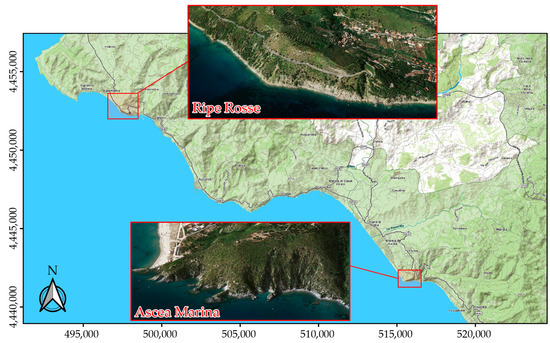 To test the model, different sites of the Cilento coast were searched to select those possibly characterized by the same “slope-over-wall” phenomenon. This morpho-evolutionary phenomenon was particularly evident in two areas [45]: (i) in the stretch of coastline called “Ripe Rosse”, in northern Cilento and (ii) to the west of the area used as training, in the coastal stretch of the Marina di Ascea reef. The data used for the test belong to the same survey campaign that produced the data used for training. Figure 2 shows the map with the areas used for testing.