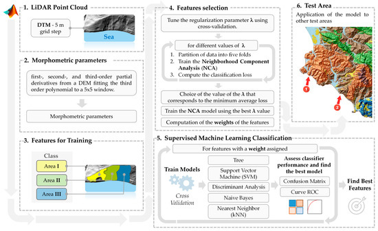 The aim of our work is to use the Supervised ML (supervised learning) technique to identify and classify a specific coastal land evolution model (slope-over-wall) that characterizes most of the Cilento soft rock coasts [45]. This geomorphological phenomenon is characterized by the presence of three contiguous areas having recognizable and previously studied geomorphometric features [6].