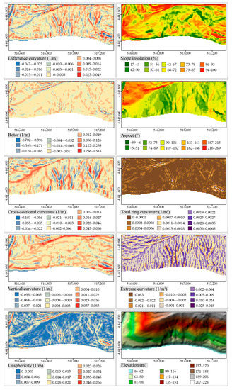 From the DTM, nine features have been derived according to the formulas reported in [47]. Curvature, particularly, has important implications for surface processes [48]. It has been shown that the quadratic models [49] can be used to model geomorphometric elements (ridges, slopes, valleys) and basic hillslope units. Higher-order polynomials, which produce non-uniform curvature for the analysis window, can represent special landform features with a more complex structure.