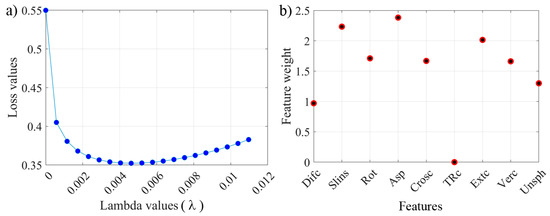 The mean of the five loss values computed for each k-fold is associated with the corresponding λ. The mean values are shown in Figure 5a for each value of λ of the considered range. The smallest loss value, equal to 0.35, is obtained in correspondence of λ = 0.0046, which is assumed as optimized parameter. In Figure 5b are reported the values of the weights relative to each feature, computed with that value of parameter.