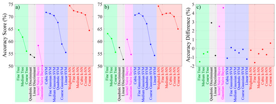 To train and select the model that best fits the input data, the MATLAB tool “Classification Learner App” was used, which is a tool that allows to train different models. All the classification models from the relevant literature were trained: Decision Trees (DT), Discriminant Analysis, Support Vector Machines (SVM), k-Nearest Neighbors (k-NN), Naive Bayes, so as to compare them and choose the one that maximizes the overall accuracy.