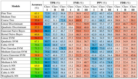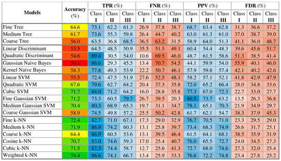 At first, models have been trained using all the nine computed features. Then, all models have been trained again after removing the TRC feature, which had resulted non-significant after the NCA. The “best” classifier, from the point of view of accuracy, was the k-NN (average score of 70%), and among the various algorithms, the best results are obtained with the Weighted k-NN. Similar comments can be made when eight predictors were used.