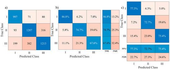 In addition, to analyze the behavior of the model for each class, some main indicators, derived from the confusion matrix, have been computed, namely the True Positive Rate (TPR), the False Negative Rate (FNR), the Positive Predictive Value (PPV) and the False Discovery Rates (FDR). In details: the TPR, also called “Recall” or “Sensitivity”, is used to measure the percentage of actual positives which are correctly identified; the FNR is the remaining percentage of TPR; the PPV, also called “Precision”, is the proportion of correctly classified observations per predicted class; the FDR is the proportion of incorrectly classified observations per predicted class. The formulas used are [57]: