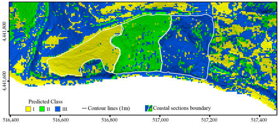 Figure 13 shows the classified map of the second area analyzed, in correspondence of the cliff of “Marina di Ascea”, superimposed on the contour lines. The figure shows that at the coastal zone (southern part), there are landslide areas with well distinguishable clusters belonging to class II. Figure 13a helps to better understand the morphology of the territory. Of particular interest are the clusters belonging to class I in correspondence of the coastal zone and in the central part (slightly eastward) of Figure 13b. In this area, on the satellite image, one can see a road descending towards the coast, not affected by landslide activities. Again, the trained model produced a classification with well-defined clusters, despite the morphological complexity of the test area.