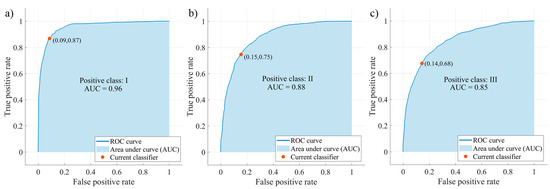 In addition, for the same purpose of assessing the classification accuracy of each single class, the standard ROC (Receiver Operating Characteristic) method was used [58]. In a ROC curve, the true positive rate (Sensitivity) is plotted as function of the false positive rate (Specificity) for different cut-off points of a parameter.