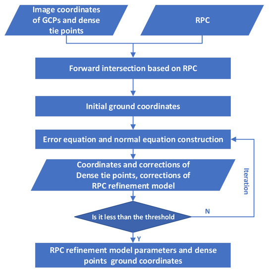 where, (X, Y) is the corresponding image measurement coordinates of GCPs; line and sample are the row and column coordinates of GCPs back-projected on the image space; and are coefficients of affine transformation. The flow of block adjustment using rational polynomial coefficient (RPC) [17,32] are shown in Figure 5. Then, DSM with a 2-m spatial resolution is generated through intensive matching of front and back images according to the refined RPC model. As the grid spatial resolution of reference DSM is one meter, which is higher than the 2-m spatial resolution of GFDM and GF7 DSMs, the bilinear interpolation method is used to resample the reference DSM to a 2-m grid to ensure the same resolution as the two DSMs. After that, the co-registration of the derived DSM and the reference DSM which is used as a benchmark is realized using least square correction, where the GCPs are used to establish the association between the derived DSM and the reference DSM.