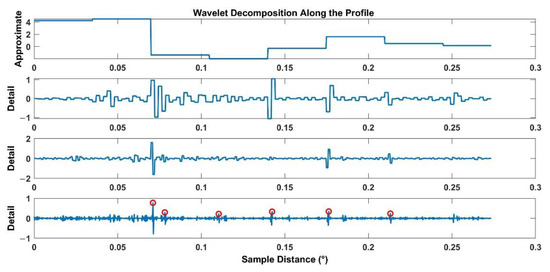 Approximate signal and detail signal after wavelet decomposition along the elevation difference profile (red circles correspond to the mutation positions detected by wavelet analysis).