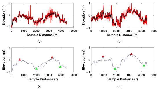 The positions of wave peak–valley detection for profiles. (a,b) are examples of profiles before (red lines) and after (black lines) elevation differences filtering. (c,d) are the positions of peak (red triangles) and valley (green triangles) which indicate the mutation positions of strips.