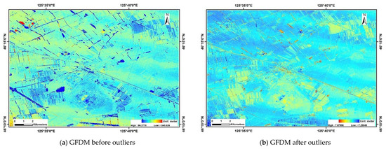 GFDM and GF-7 difference DSMs before and after outliers were removed: (a) GFDM difference DSM before outliers were removed; (b) GFDM difference DSM after outliers were removed; (c) GF-7 difference DSM before outliers were removed; (d) GF-7 difference DSM after outliers were removed.