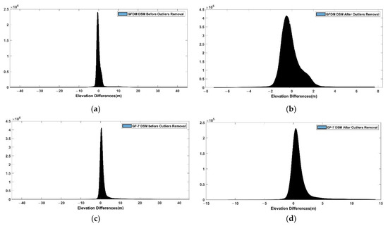 Histograms of GFDM and GF-7 difference DSMs before and after outliers were removed: (a) histogram of GFDM difference DSM before outliers were removed; (b) histogram of GFDM difference DSM after outliers were removed; (c) histogram of GF-7 difference DSM before outliers were removed; (d) histogram of GF-7 difference DSM after outliers were removed.