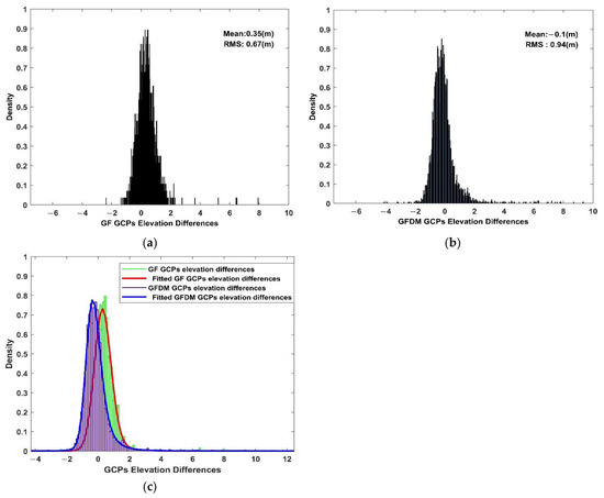Histograms of (a) GF-7 DSM differences; (b) GFDM DSM differences; and (c) GF-7 DSM differences and GFDM DSM differences comparison based on ground observations.