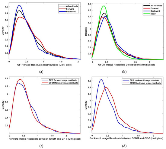 Comparison of image residuals distributions with different views for GFDM DSM and GF-7 DSM: (a) distributions of GF-7 forward, backward, and all image residuals; (b) distributions of GFDM forward, backward, nadir, and all image residuals; (c) comparison of GFDM and GF-7 forward image residuals; (d) comparison of GFDM and GF-7 backward image residuals.