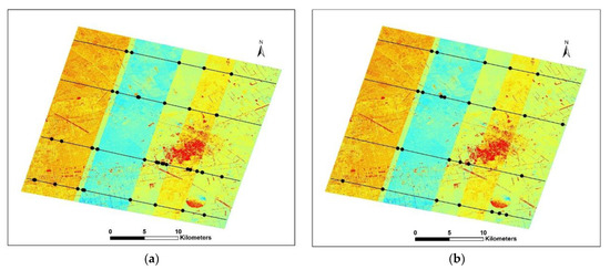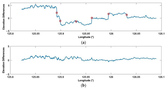 According to the strip’s detection described in Section 3.4, the strips which may possibly be in GF-7 DSM and GFDM DSM are detected and compared. From the display effects of the two DSMs in Figure 9, GF-7 DSM presents almost no obvious striping. In order to test the possible striping characteristics of GF-7 DSM, the DSM, before complete calibration, conduct strip detection. Figure 17 shows the strip position points of GF-7 DSM detected by 4 cross-track profiles (the black lines in Figure 17) using wavelet decomposition and wave peak-valley detection of profiles, respectively. From its distribution, all the mutation strips are detected, and these peak mutation points in cross-track are all at the edges of the strips, which is consistent with the DSM display visually. Because the strip changes irregularly, the strip positions detected by the wavelet decomposition method of profiles are more accurate than that by wave peak-valley detection. According to the detection results, at the edges of the strips, the elevation varies abruptly, and the amplitude of elevation differences is close to 5 m. The widths of strips are not uniform, and the average interval of the strips is about 0.0385°, about 4km. Figure 18 shows the elevation differences along the profile before and after calibration for GF-7 DSM. It indicates that the striping phenomenon of GF-7 DSM (Figure 17a) is almost eliminated after the calibration.