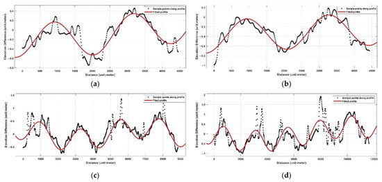 Compared with the irregularity of the strips or the disappearance after the calibration of GF-7 DSM, the strips in GFDM DSM are relatively regular (the pale-yellow diagonal strips in Figure 9), showing almost equally spaced strips. In this study, 9 profile lines (as shown in Figure 19) are used, and the elevation differences along profiles are extracted. Figure 20 shows the elevation difference profiles of 4 of them. It can be seen from the figures that the vertical errors along the profile fluctuate, but they show obvious regular sinusoidal wave fluctuation after smoothing as shown with the red curves in Figure 19. According to the statistics of peak and valley points fitted along the profiles, the strip fluctuation interval of GFDM DSM is about 2400 m, and the amplitude range is between 0.33 and 0.64 m