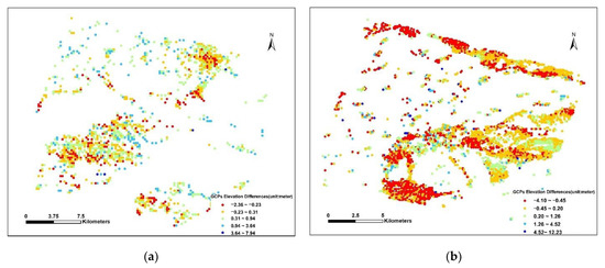 Distribution and elevation differences of GCPs of (a) GF-7 DSM and (b) GFDM DSM in the study area.
