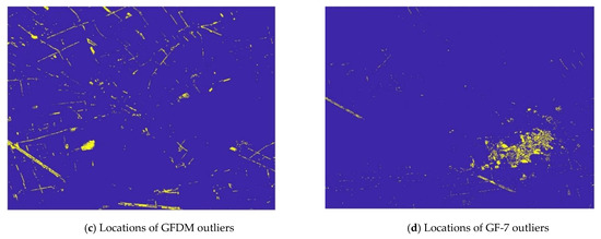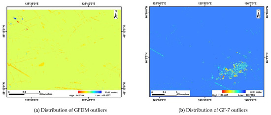Outliers can be caused by a variety of factors, including surface changes, satellite positions and attitudes, and data processing methods. The instants of acquisition of the two DSMs in investigation, the reference DSM and the GCPs, are different, which would lead to some outlier causing by surface changes. This is also the main reason for removing outliers. In the comparison of the two DSMs, the reference DSM used is consistent for the same acquisition time and data process, and the same for GCPs. The acquisition times of GFDM and GF-7 images are almost the same, which can also ensure the consistent surface changes. Figure 23 shows the outliers distribution in GFDM difference DSM and GF-7 difference DSM. Figure 23c,d displays the locations of outliers more clearly after image binarization. Most of them are located in the areas with obvious boundary characteristics, such as roads or houses. Although the regions do not overlap completely, the inconsistency of surface changes can be largely eliminated according to the method described in Section 3.2. In this study, outliers are not involved in the accuracy evaluation. However, in subsequent studies, data with complete overlapping region and overlapping time may be better for the elimination of inconsistent surface changes.
